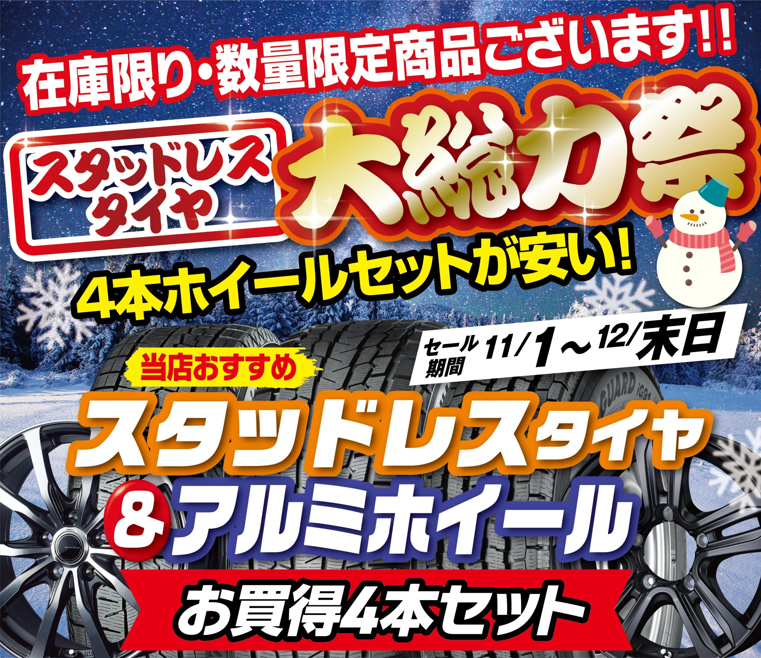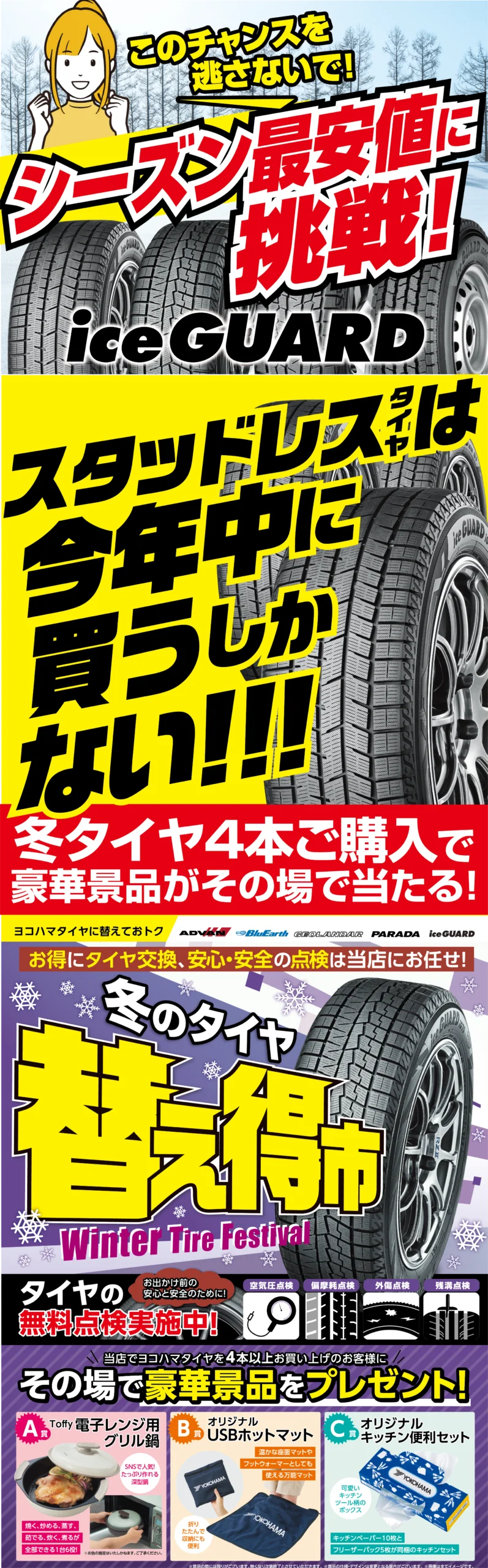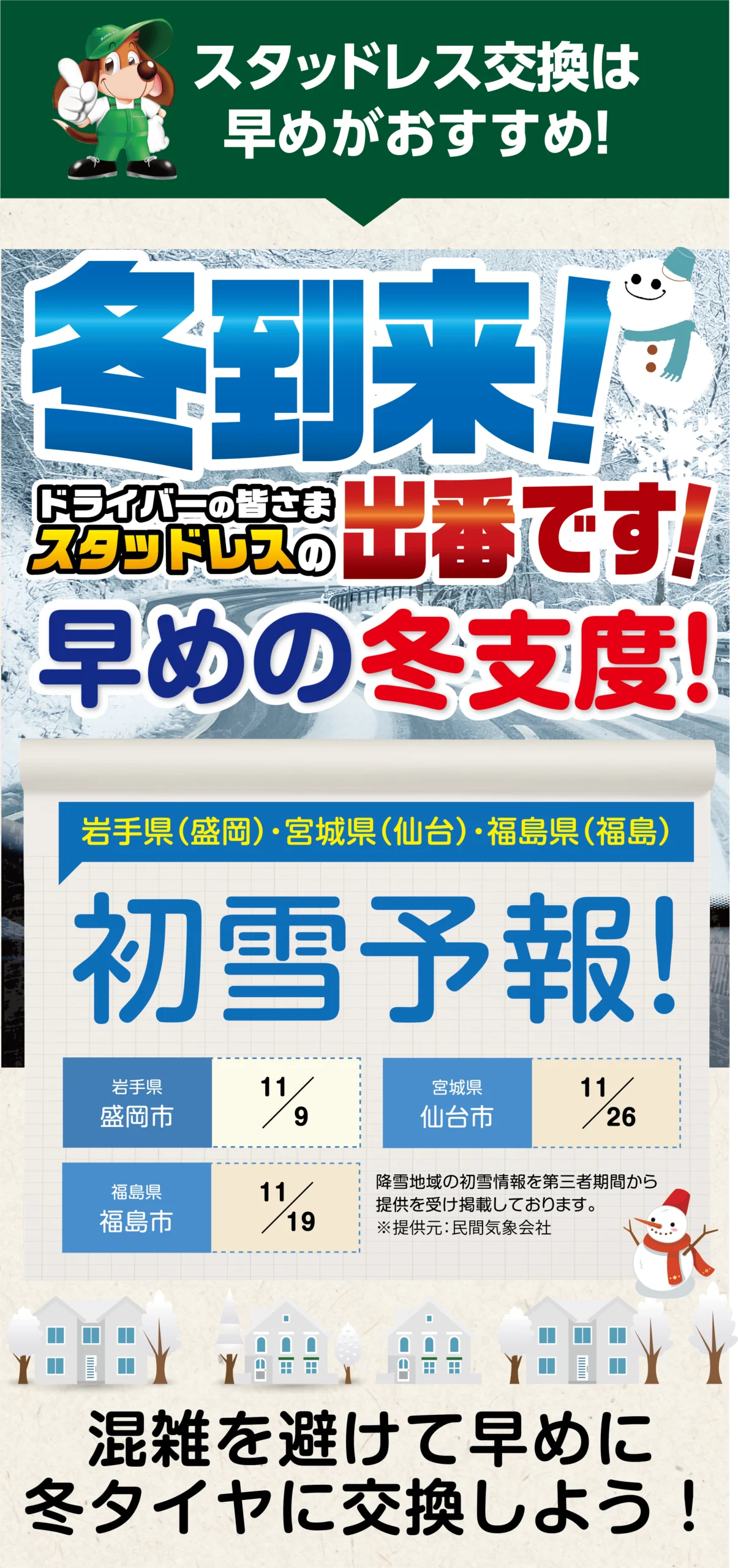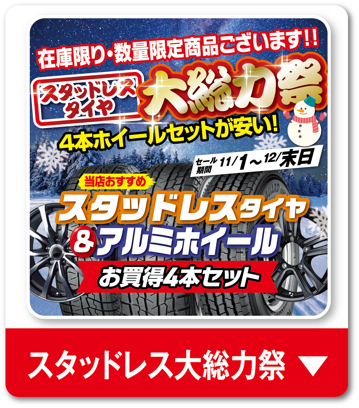 タイヤガーデン東北 2024.03.292025.10.31 INDEXお買得情報・店舗紹介 SHOP SITE 冬シーズン最安値へ挑戦 旧モデル品のスタッドレスが安い スタッドレスは早めの履き替えがおすすめ タイヤ交換5つの安心 セール対象店舗 WEB SITE株式会社ヨコハマタイヤリテール東北について YOKHAMA TIRE取り扱いタイヤについて